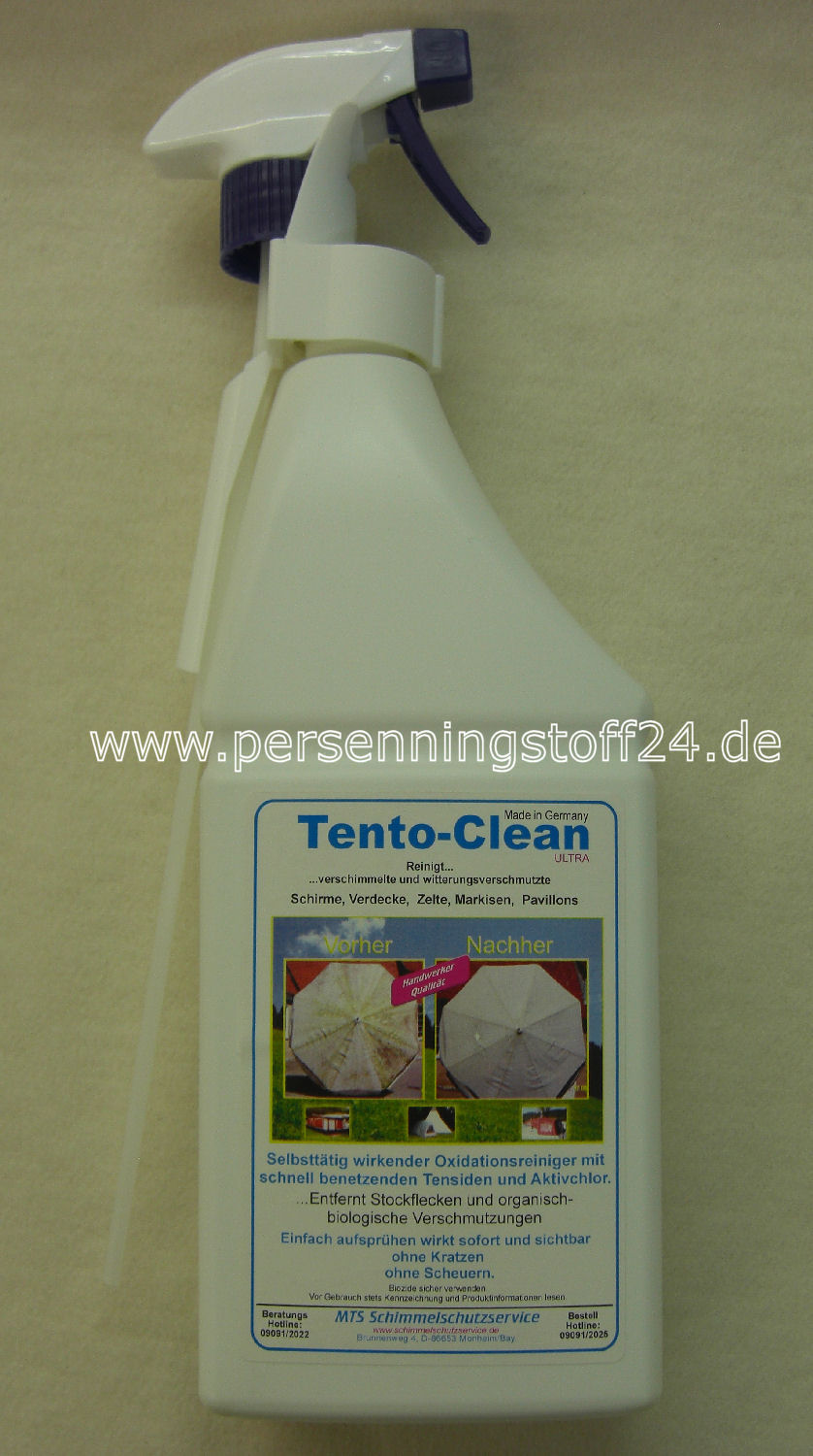 Desinfektion und Entkeimung, für Stoffe, Leder, Gummi, und polymerisierte Materialien. Flüssig, zur Reinigung von verschimmelten und witterungsverschmutzten Zelten, Markisen, Pavillons, Schirmen, Planen, Abdeckungen und dunkelfarbigen Bootverdecken.